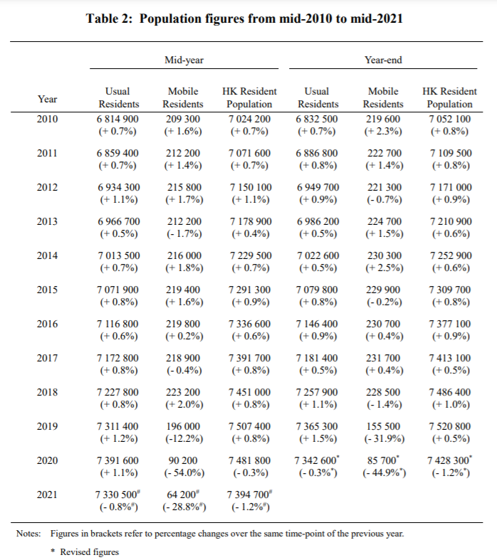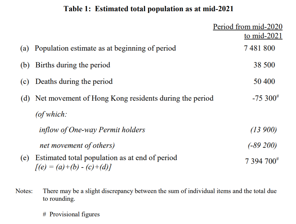 According to the statistics released by the Census and Statistics Department today (August 12), the provisional estimate of the Hong Kong population was 7 394 700 at mid-2021, representing a decrease of 87 100 or 1.2% from 7 481 800 at mid-2020 (Table 1).