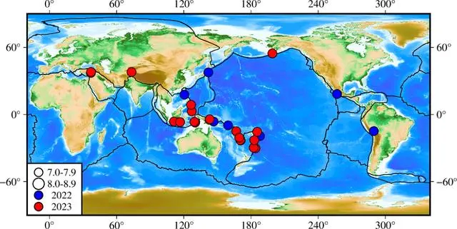Figure: Map of Global Earthquakes with Magnitude 7 or above in 2022 and 2023