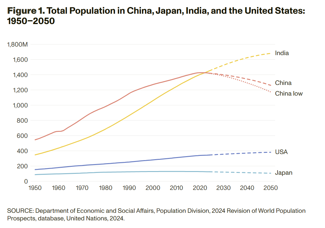 China is facing a population upheaval that could reshape its future. In 2022, China's population shrank for the first time since the famine of the Great Leap Forward (1959–1961). China has one of the world's lowest fertility rates, and its population decline is accelerating. By 2050, China's population could lose 250 million people from its 1.4 billion (as of 2026)—nearly three-quarters of the United States' 2026 population (see Figure 1).
