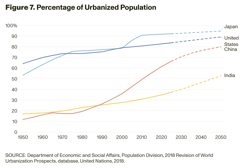 One lever to maintain economic growth is to entice more of the rural population to move to cities. Higher urbanization could be expected to boost economic growth and has been one of the main engines of China's economic boom through infrastructure development, economies of scale, innovation, and entrepreneurship. China's rate of urbanization, about 65 percent, lags that of most other industrialized countries, leaving substantial room yet to grow. However, nighttime light satellite imagery suggests that urbanization in China is already largely complete or at least well above the United Nations Population Division's 2025 estimate, and China's census data show that rural residents are much older than those living in cities, making it harder to achieve gains (see Figure 7).
