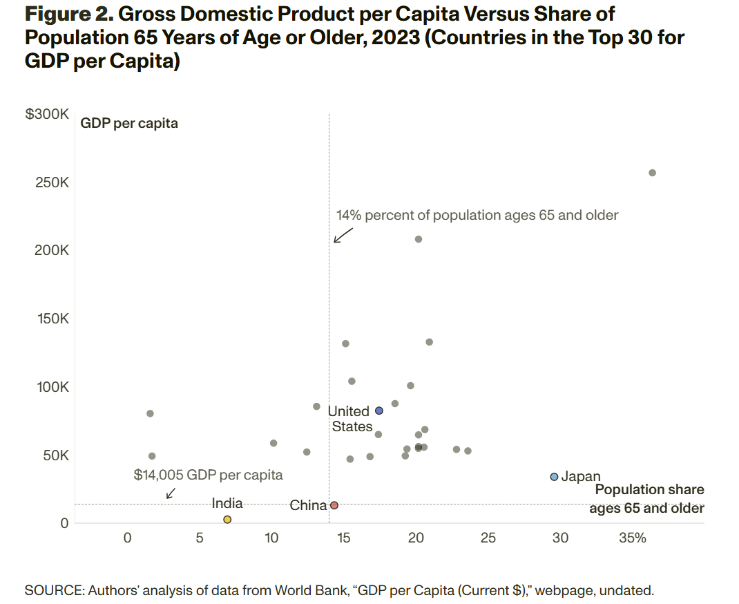 Compounding the aging challenge, China is yet to become a high-income nation.[2] Often, countries undergoing fertility decline benefit from a demographic dividend—a time of economic growth driven by a large working-age population compared with smaller numbers of dependents ages 65 and older and younger than 15. Beginning in the 1980s, China experienced unprecedented economic growth during its dividend period, but because it started later than its neighbors (such as Japan and Singapore) and its speed of fertility decline has been faster than others, it has exited this demographic dividend era with relatively low income per capita, leaving it with fewer resources to address the pressures of an aging population. For example, the United States and Japan both have higher shares of people ages 65 and older than China, but both countries also have substantially higher average economic output per person (gross domestic product [GDP] per capita), providing a higher standard of living and economic well-being for their residents, and more economic resources to support their aged populations. The United States and Japan got rich before they got old, but China got old before it got rich, which will pose challenges in the future (Figure 1). India, which has a population that is just starting to age, is not yet rich or old but may still be able to capitalize on the window of opportunity offered by its demographic dividend (see Figure 2).