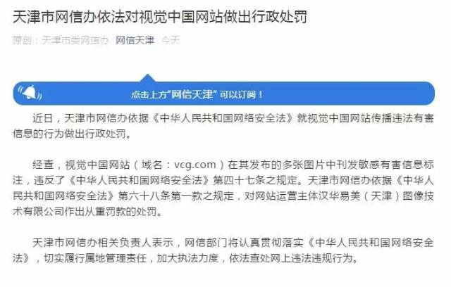 Visual China Group, which owns Chinese photo platform vcg.com, was fined 300,000 yuan ($44,758) for flawed supervision of user content, according to a company statement late Thursday.