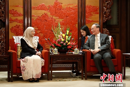 Chinese Vice President Wang Qishan met with Malaysia's Deputy Prime Minister Wan Azizah Wan Ismail on Tuesday, calling for enhanced bilateral ties.