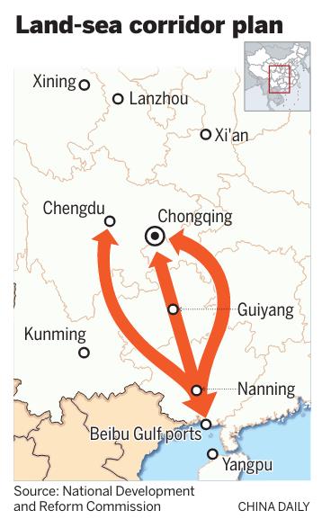 The new land-sea corridor will extend primarily from Chengdu in Sichuan province and Chongqing to a group of Beibu Gulf ports in the Guangxi Zhuang autonomous region and Yangpu Port in Hainan province. It also will better connect China's inland northwestern region to major ports in the south.